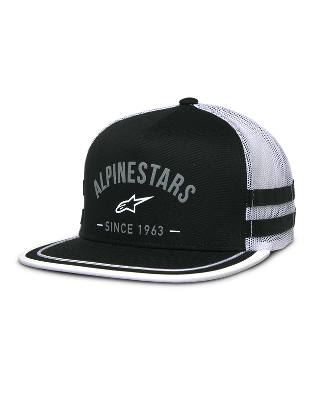 • Twill front fabric, poly mesh back. Suttache trim on bill, side applique stripes
