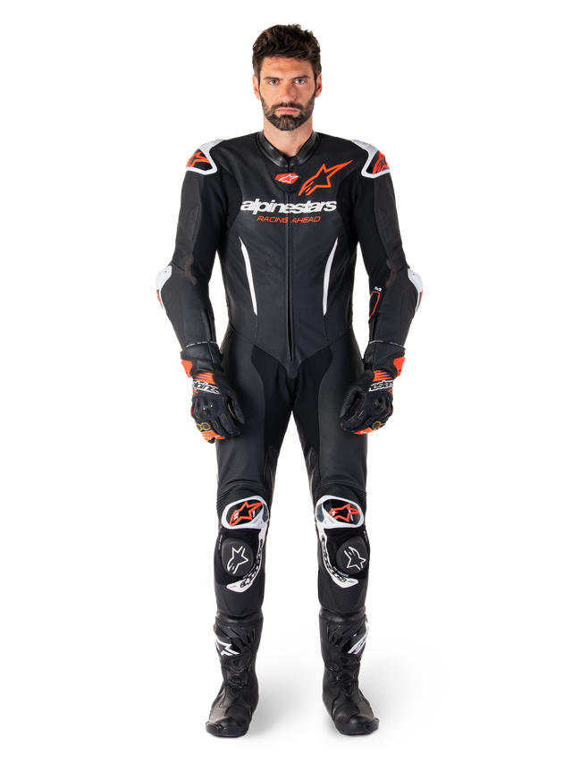 • Pre-curved arms, legs and body, with extended multi-directional leather accordions at the shoulder blades, lower back, and knees for an enhanced ‘Race Fit.’