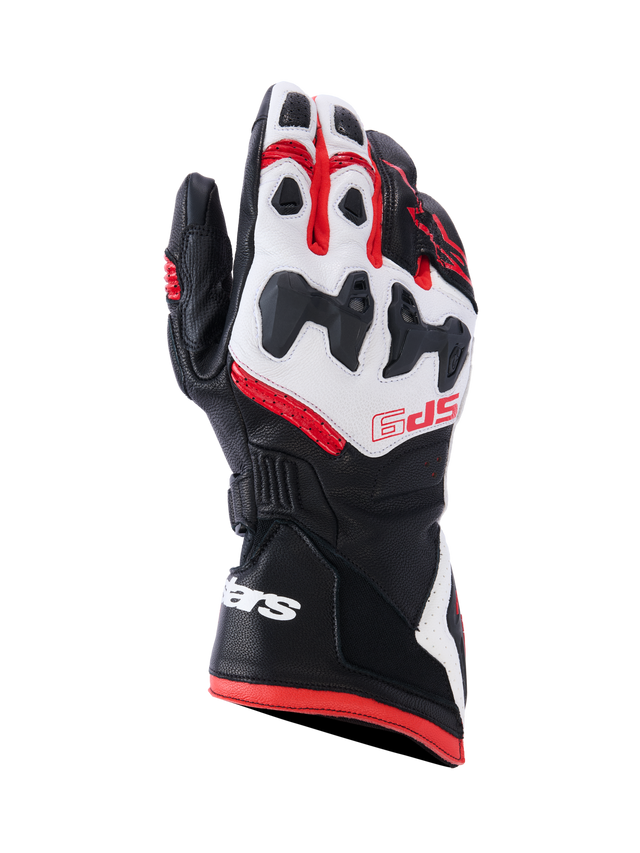 Alpinestars SP-9 Gloves, Motorcycle Racing Gloves, Black White and Red, protective knuckle padding, textured grip sections, reinforced fingers, ventilation holes, durable construction with wrist logo